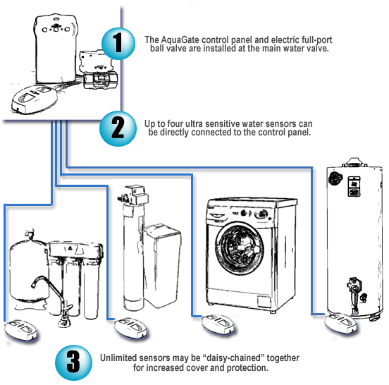 The Aquagate detects leaks by sending a pulse every second through two stainless steel probes at the bottom of each sensor. In the event of a leak,